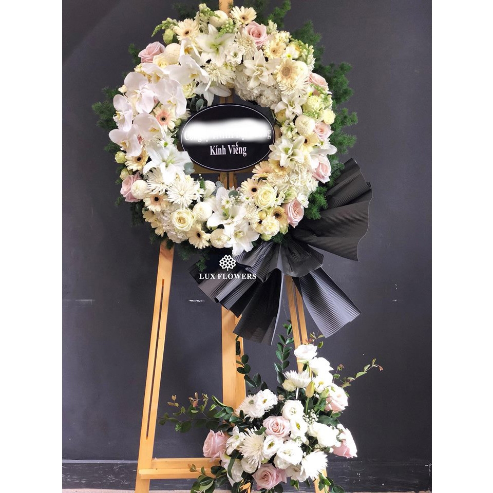 Kệ hoa chia buồn tone màu trắng kem