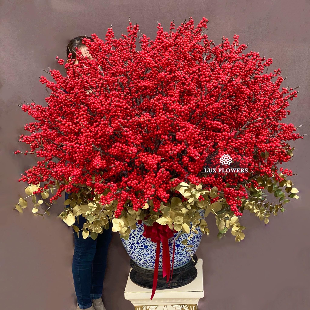 Bình hoa 100 cành Đào Đông Đỏ mix lá bạc phun nhũ vàng